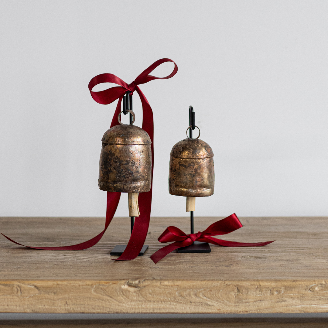 Antique Inspired Vintage Bell Stand Stand by Luxe B Co. features vintage bell stand, showcasing welded hooks that form a distinctive and artistic arrangement.The bells themselves are handcrafted, exuding a charming vintage appeal. They are crafted with a patina copper brass finish and will not be a perfect circle shape to capture the antique aging. They can add a striking decorative touch to any living area.